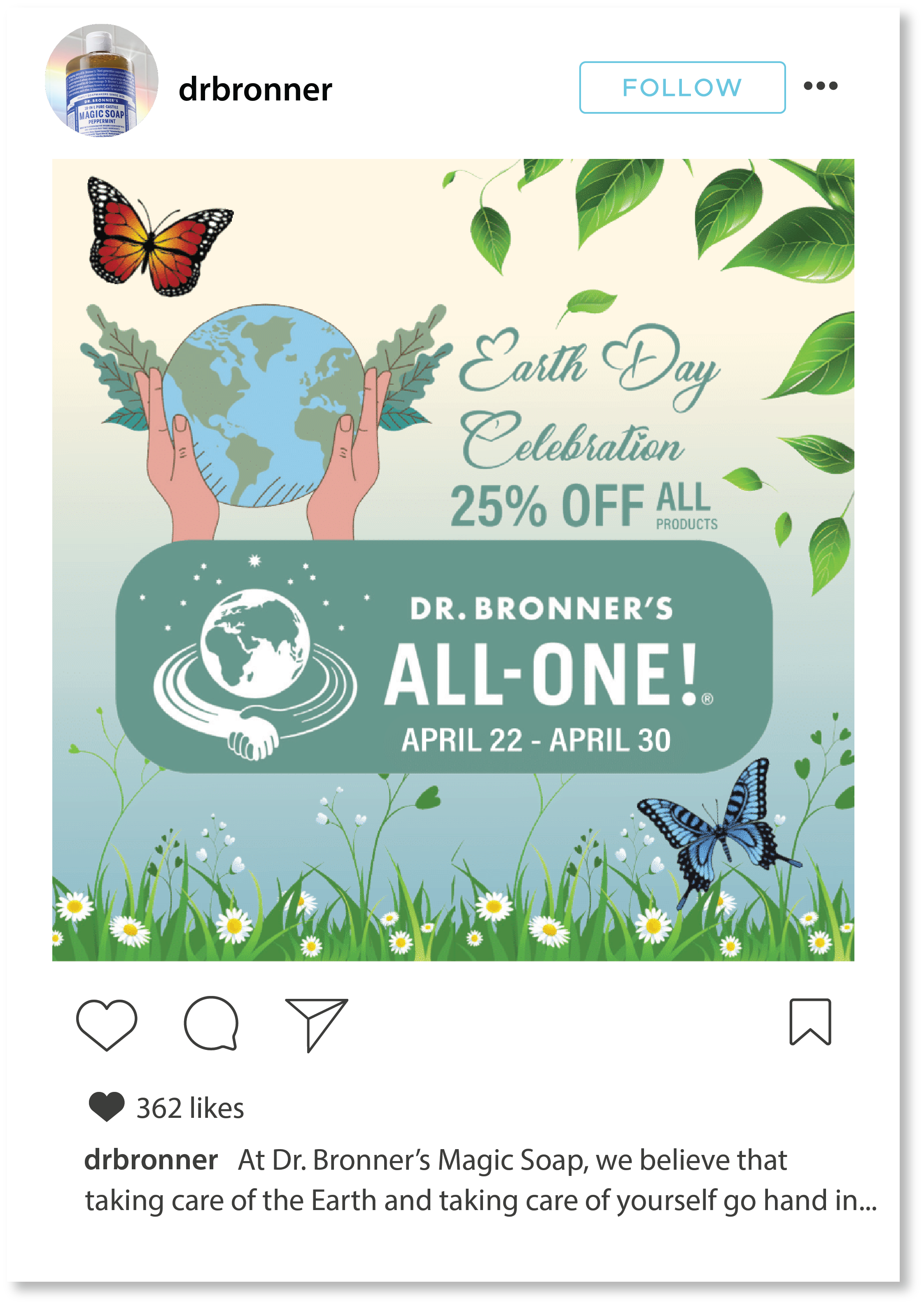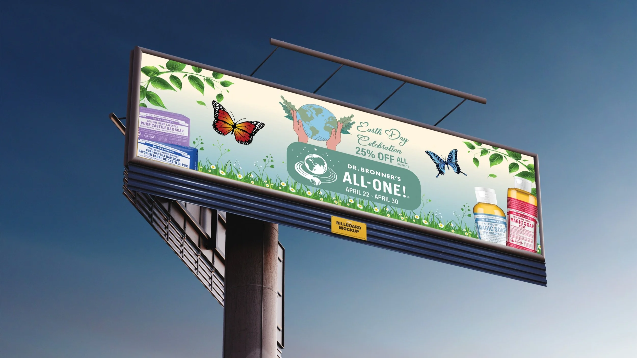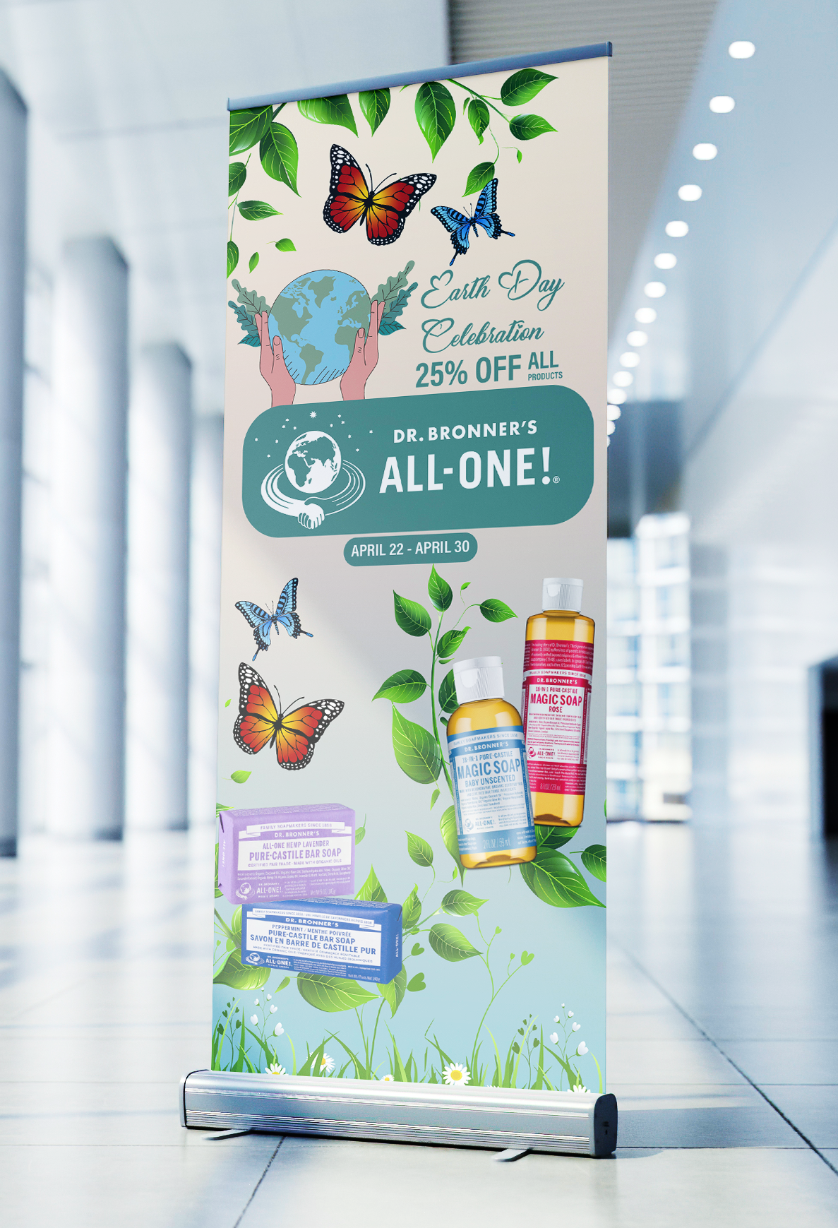 This campaign required the creation of posters, flyers, social media graphics, a billboard, and stand-up display for Dr. Bronner’s Earth Day celebration sale. Design elements such as leaves, flowers, and butterflies were used to reflect the energy and positivity of Earth Day as well as the eco-consciousness of the Dr. Bronner's brand.